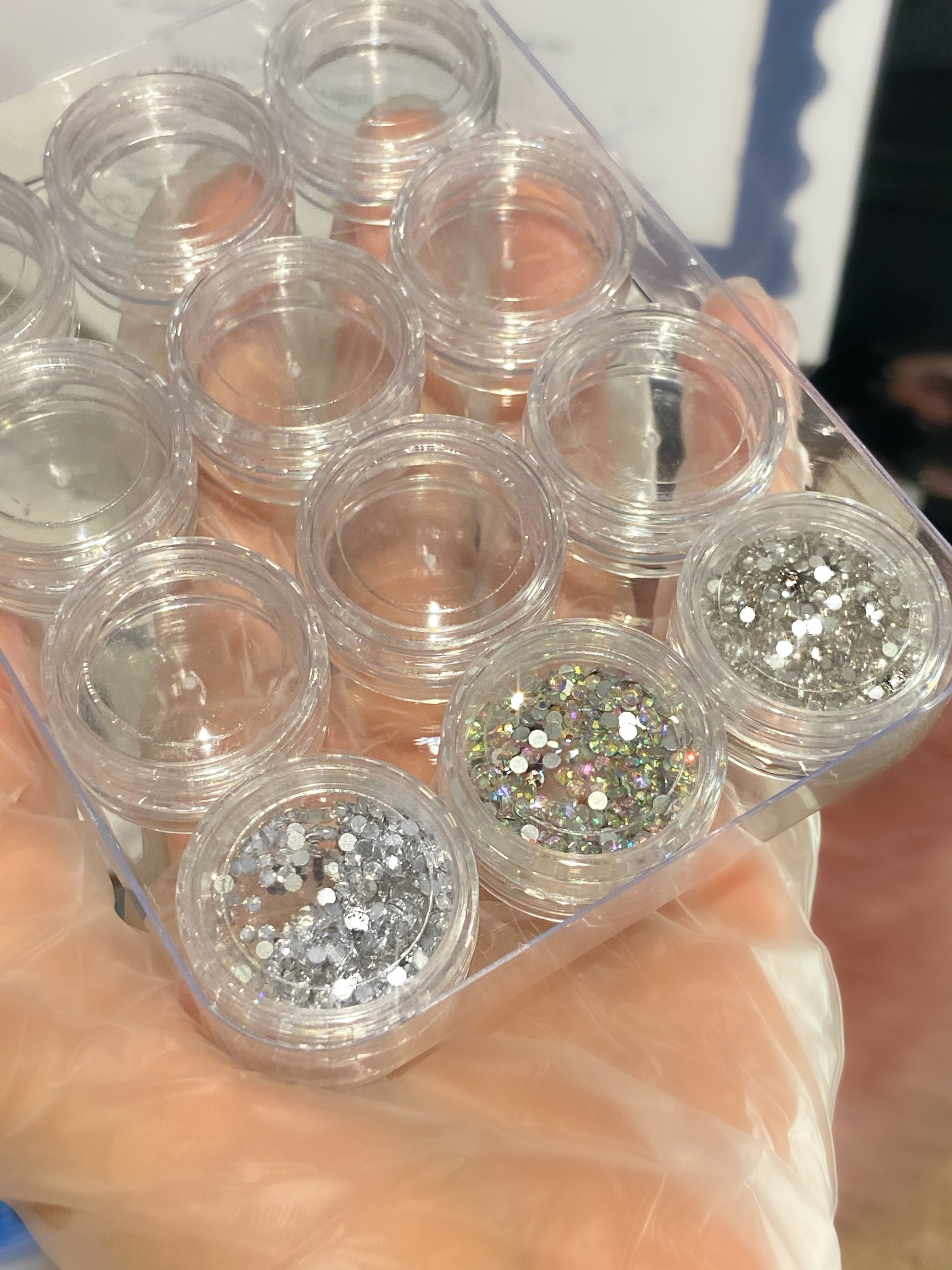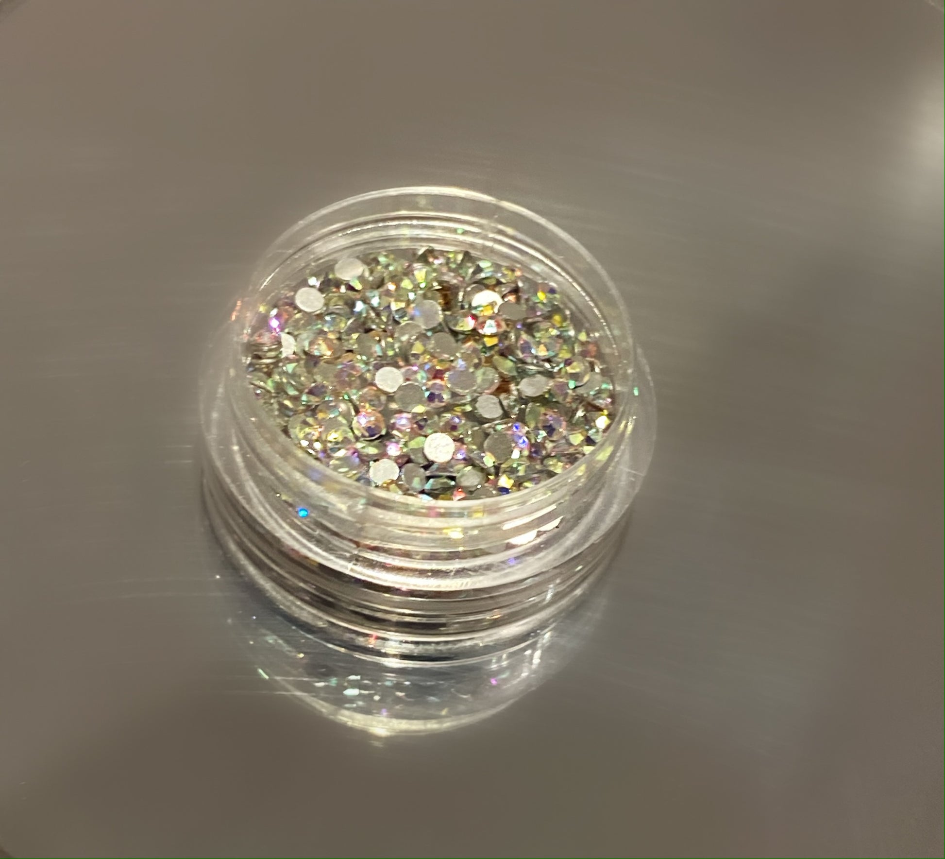 Kristallbehälter mit 300 Kristalle in 2 verschiedene Farben, Zahndisplay für Übungen, Lotionen, 2 Geräte, ein Pinzettenset für die Entfernung und Schulungsheft + Zertifikat. Übrigens sind die Geräte einmaligen Kauf. Die Lotionen, die irgendwann nachgekauft werden müssen, von denen verbraucht man sehr wenig, was die Behandlung sehr günstig macht.